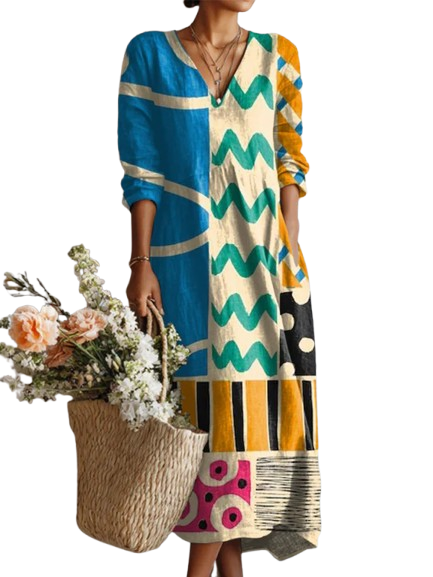 AMELIA | Vintage Abstract Geometry Art Print Linen Pocket Dress