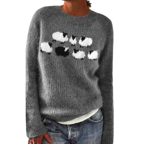 A soft, fluffy pullover that combines warmth and style—perfect for instantly making your fall look more comfortable. Subtle sheep print adds character without being overpowering.